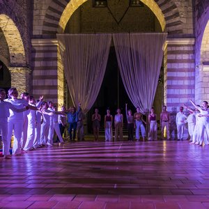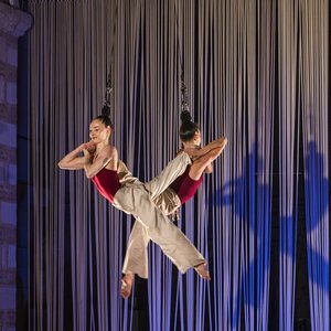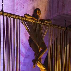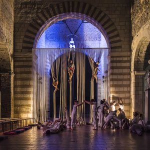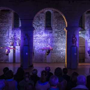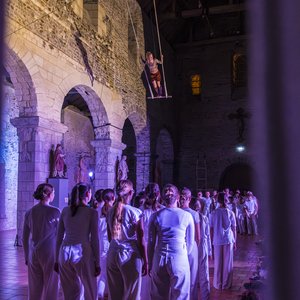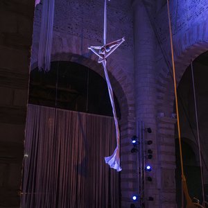 C’est une traversée poétique et sensorielle. Le spectacle explore la suspension du temps : celle des corps en vol, des voix qui s’élèvent, de la lumière qui glisse sur la pierre. Comme des poussières d’étoiles, les artistes - danseuses aériennes, chanteurs, musiciens - viennent révéler les volumes de la Collégiale, la peupler de vibrations humaines, de souffles et de gestes suspendus.