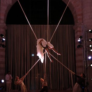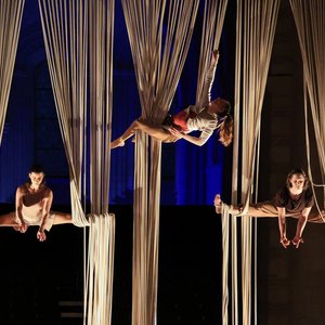 Circassiennes aériennes : Izabelė Kuzelytė (tissu aérien), Lisa Rinne (trapèze ballant), Anastasiia Sholokhova (suspension capillaire), Ariadna Vendelova (danseuse aérienne), Charlotte de la Bretèque (multicordes) et Elli Skourogianni (cerceau aérien)
